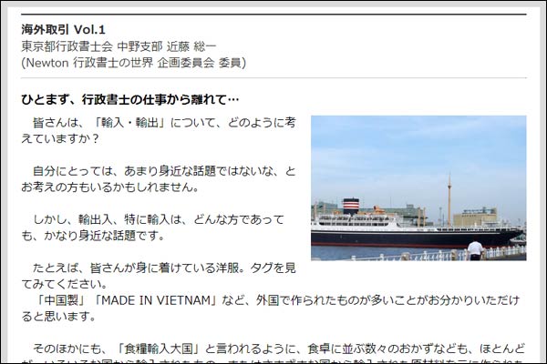「海外取引 Vol.1」は、東京都行政書士会中野支部(Newton行政書士の世界・企画委員)近藤総一先生が執筆。「・・・輸出入において大きな問題となってくるのは、そもそも貨物が輸出入できるのか、できるとして、国内法によるさまざまな規制をクリアできるのか、ということです。・・・」