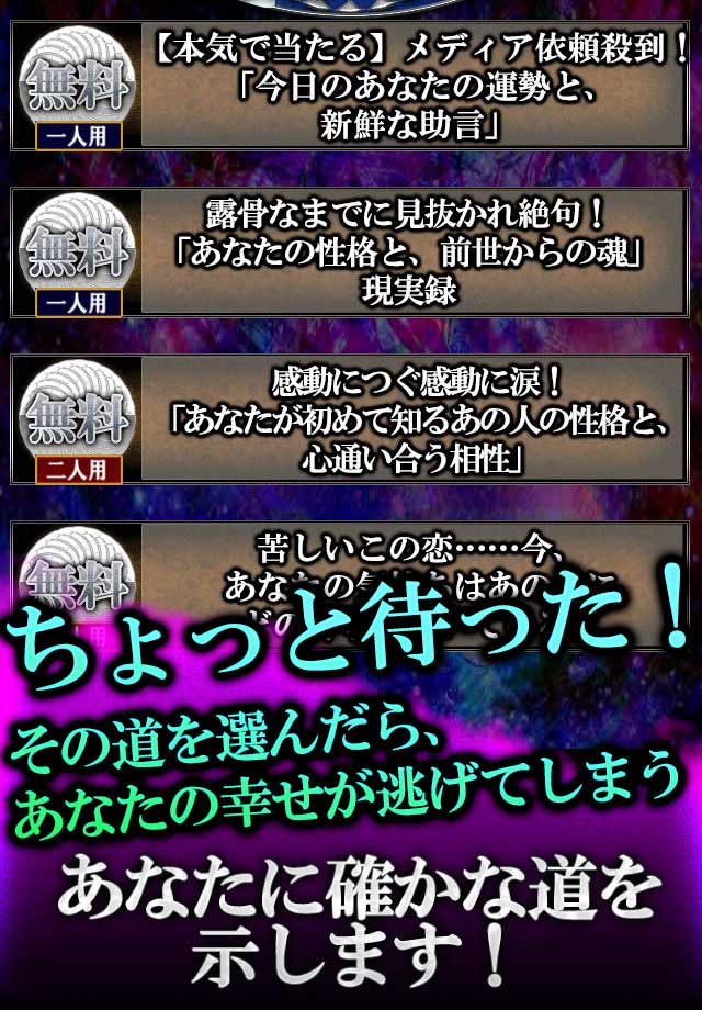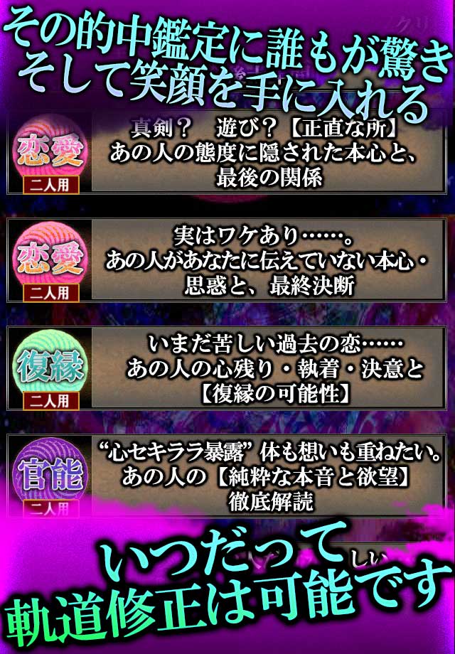 当たると言う部分に対して極限まで追求した的中率と、霊的なまでに高められた現実構成力であなたのこの先の運命のリアルを具現化いたします。心に覚悟ができているのなら、是非私と一緒に素晴らしく豊かな現実を明らかにしましょう。