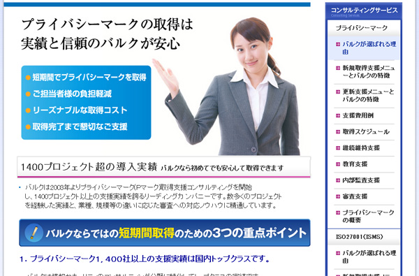 バルクは情報セキュリティのコンサルティング分野ではPマーク1,400社超、ISO27001は380社超の国内トップクラスのコンサルティング会社です。