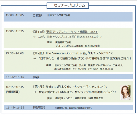 また、特別セミナーとして、饗応料理研究家 緋宮栞那(ひみやかんな)先生をお招きして「美味しい日本文化、The Samurai Gourmetの心とは(仮)」も開催いたします。皆様お誘い合わせのうえ、ぜひご参加ください。