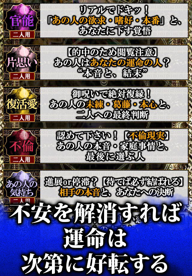 鑑定メニューは無料メニュー4メニューに加え、 詳しく鑑定できる有料(500円~2000円)18メニューの全22メニューをご用意しました。