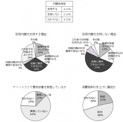支持政党別では、自民支持の91%、公明支持の49%、維新支持の39%、みんな支持の31%が安倍内閣を支持し、野党支持者でも安倍内閣に一定の支持があることが伺えるが、民主支持層では24%に留まった。また「安倍内閣」を支持する理由では、「政策に期待できるから」が32%と最も多く、支持しない理由でも「政策に期待できないから」が51%となり、若者の政策重視の傾向が伺える。