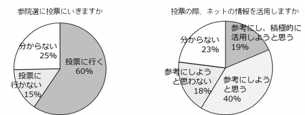 また、この夏に行われる参議院選挙の投票に行くかと聞いたところ、60%の若者が「投票に行く」と答え、意外にも投票の意欲が高く、「分からない」と答えた若者は25%、投票に行かないと答えた若者は15%に留まった。男女別では、男性の65%が「投票にいく」と答え、女性(53%)を上回った。年代別では、20代の56%、30代の63%が「投票にいく」と答え、30代が上回った。さらに、投票に行くと答えた若者の72%がネットの情報を「参考にする」とも答え、若者ネットユーザー層は投票に積極的かつネット選挙解禁を肯定的に捉えていることが分かった。一方、投票に行くか「分からない」と答えた若者で、ネットの情報を「参考にする」は35%にのぼり、ネット選挙が彼らの投票に結び付けられるかが、若者の投票率向上のカギとなると思われる。