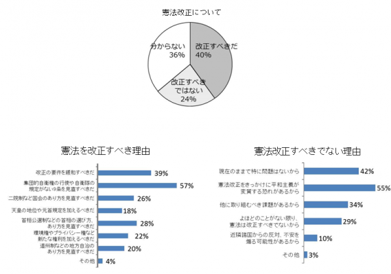 憲法改正については、「改正すべきだ」と答えた若者が4割にのぼり、「改正すべきでない」(24%)を圧倒し、ネット若者層では改憲支持が多いことが分かった。男女別では、男性の46%が「改正すべきだ」と答え、女性(34%)を上回った。一方、「分からない」は36%で、特に女性では42%が「分からない」と答え、男性(30%)を上回り、改正論議そのものが若者層、特に女性層に浸透していないことが浮き彫りとなった。