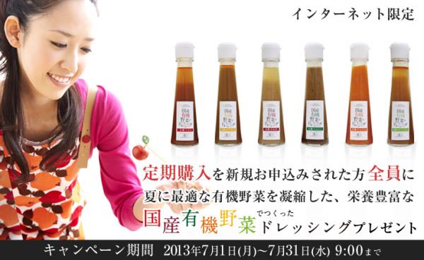 ⇒「ミリオンプレミアムの国産有機野菜で作ったドレッシング」(2種類)を、各1本ずつプレゼントいたします。