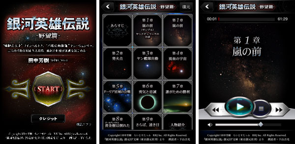 銀河英雄伝説朗読アプリイメージ。TOP画面から各章を選択し、プレイヤーにて朗読音源を再生出来ます。