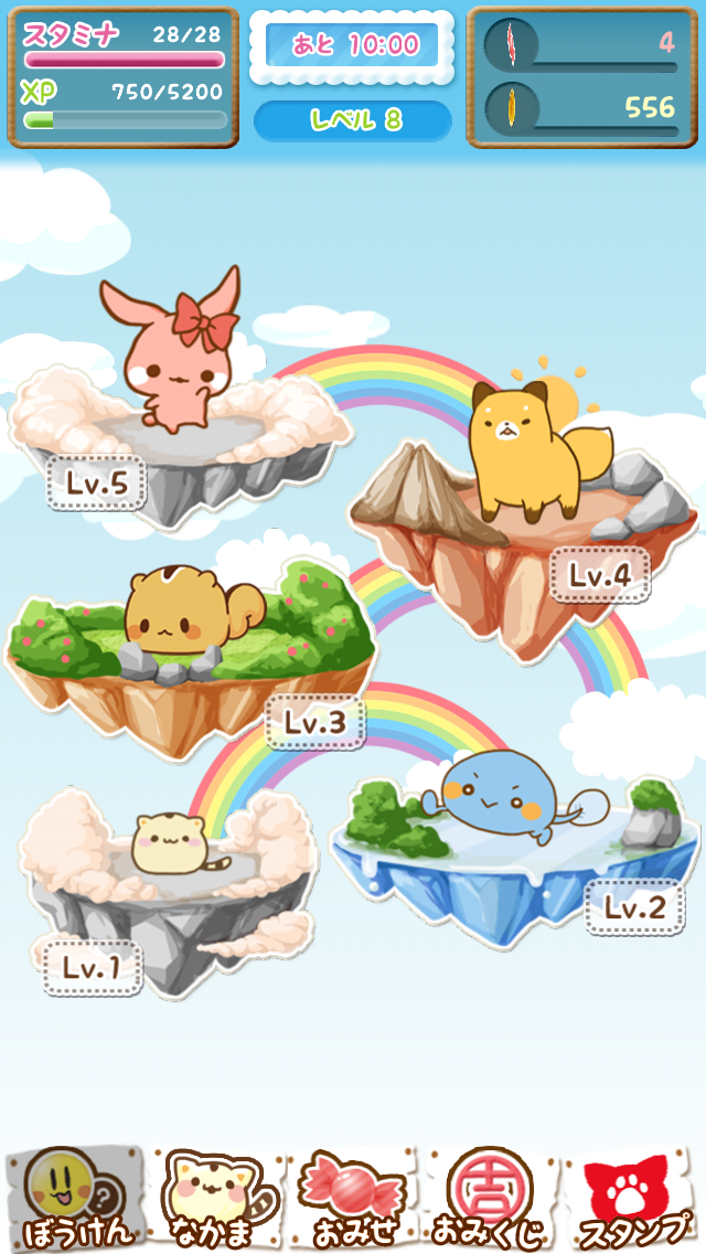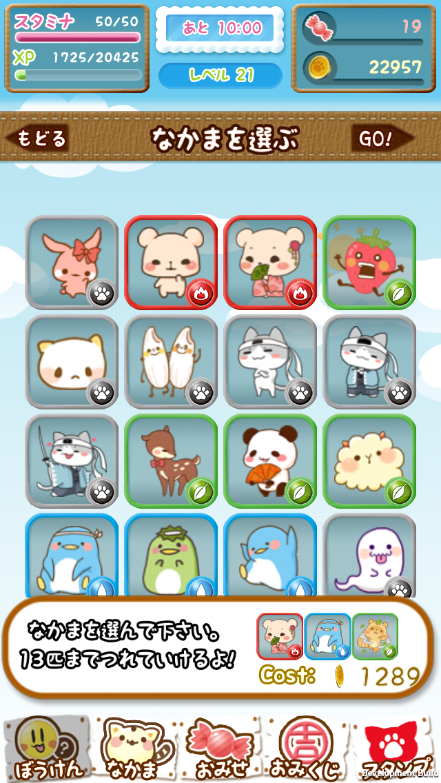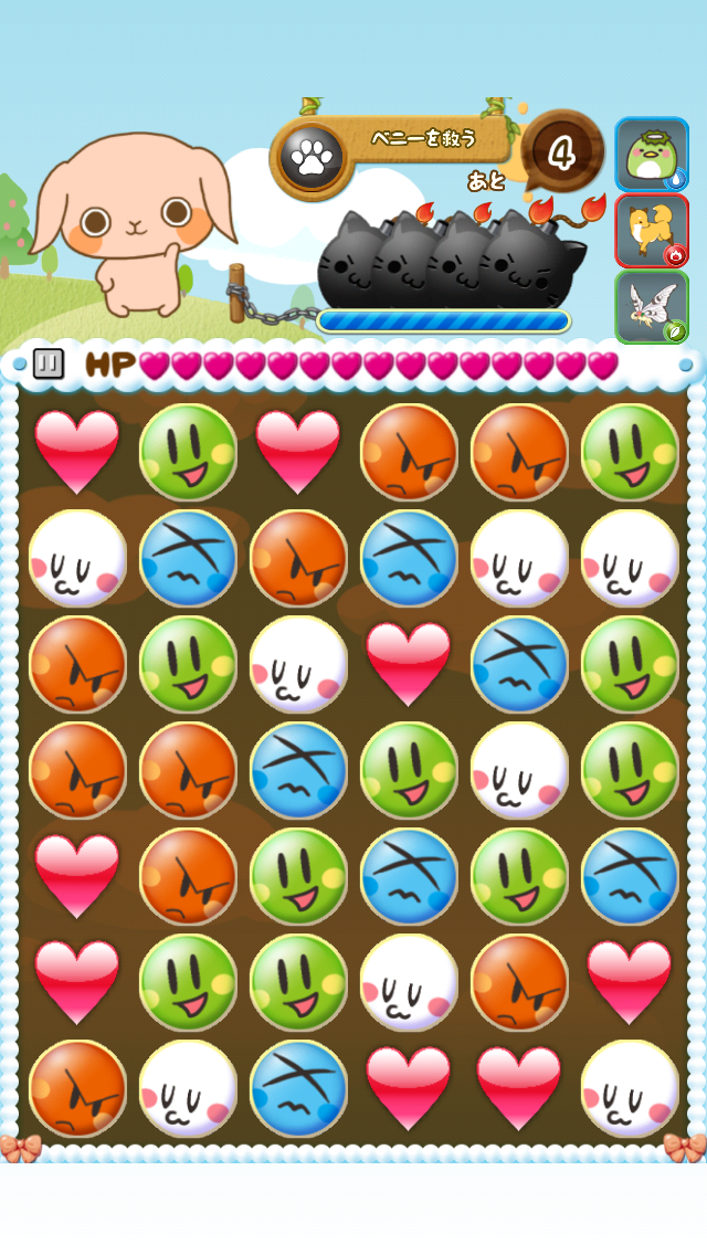ゲーム内容は、同じ色の絵文字(エモジェム)をなぞって消していくたけの簡単パズル。パズルゲームとしての気持ちよさ、楽しさを追求しながらも、RPG的な要素を盛り込んでいます。ユーザーは、敵キャラクター"悪いバクダン"に捕まったカワイイ仲間たちをパズルの力で救い出しながらステージをクリアしていきます。救い出した仲間、おみくじでゲットできる仲間は、パーティーに加えることができ、ステージクリアするために攻撃、防御、体力など様々なスキルで力を貸してくれます。これらの仲間キャラクターは、200以上用意されており、仲間一覧でコレクションすることができます。