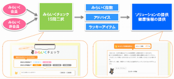 日本人の健康を規定する8つの習慣(※1)から構成される15問二択の質問に答え、性別、年齢区分を選択することで、回答結果から判定した“みらいく指数”、理想的な健康習慣をサポートする“アドバイス”、“健康ラッキーアイテム”を表示し、より理想的な「健康をデザインする」ことをサポートします。