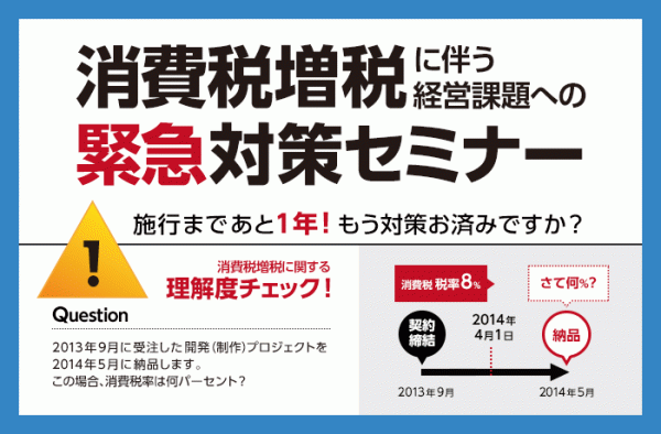 本セミナーでは、広告・ソフトウェア開発・ITサービス・設計・エンジニアリング業などのプロジェクト型ビジネス、知識労働集約型サービス業に特化し、「税務」「業務プロセス」「システム選定」の3つの重点分野における消費税増税の対策ポイントを解説します。施行までまもなく1年を切る消費税増税への対策を効果的に進めるヒントをご提供致します。