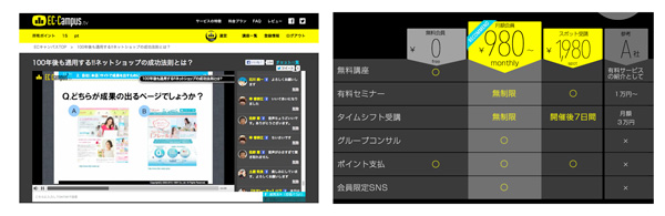 『ECキャンパス』は全国のネットショップを運営するネットショップオーナーがネットショップ運営のノウハウを学ぶことができるeラーニングサイトです。『ECキャンパス』の活用によって、「ショップの売上を伸ばしたいけどやり方がわからない」 「セミナーに参加したいけど高い」「地方なのでまわりに相談する人がいない」などといった特に、中小・零細のネットショップオーナーが持つ悩みを解決し、さらに、共通の悩みを持った仲間と学び、助け合い、ノウハウを共有することができます。