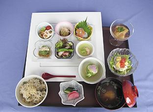 内容:・焼き茄子浸し ・枝豆ムース ・オクラ饅頭 ・こんにゃくそうめん ・鱧南蛮漬け ・和牛カルビ ・生ハムとアボカドのサラダ ・白身魚の梅ジュレ和え ・新生姜ご飯 ・香物 ・お椀 ・デザート