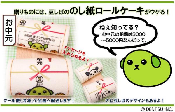 「プリロール」を運営する株式会社栄通(本社:東京都八王子市)は、「ねぇ知ってる?」でおなじみの株式会社電通のキャラクターである「豆しば」をプリントしたロールケーキ(プリロール)の「お中元デザイン」を、2013年7月4日(木)に発売致しました。のし紙風のデザインが新しく楽しい。お好きなメッセージ(30文字まで)をロールケーキに直接プリントできるデザインもご用意しています。