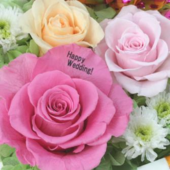 枯れることなく長く飾っていただくことができるプリザーブドフラワーはお祝いの品として人気があります。プリザーブドフラワーのなかでも人気があるバラの花に新郎新婦のお名前、結婚記念日、入籍記念日、お二人へのメッセージなど16文字以内であればお好きなメッセージを印字してプレゼントすることができる世界に一つだけの結婚祝いになります。