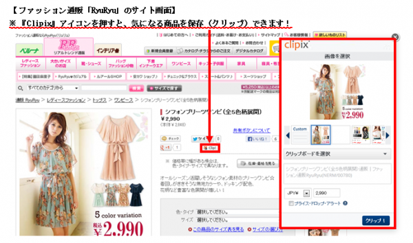 Clipixは、ネットで見つけた情報やパソコン/スマホ内の情報(写真、音楽、文書等)を何でも保存(クリップ)できる、無料のウェブサービスです。好きな芸能人の動画や欲しい商品など、気に入った情報は何でもクリップ!お気に入りのアイテムを簡単に分かりやすく整理整頓することができます。クリップしたデータは、特定の友人とシェアすることも、限定公開にしてウィッシュリストとして使用することもできます。今回の提携を機に、Clipixはネットショッピングをより便利に、より楽しく進化させて行きます。