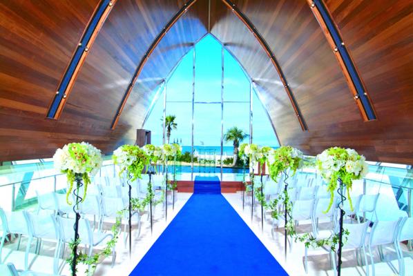北九州市の中心部から車で30分の北九州随一のリゾート脇田エリアに位置いたします。海、太陽、緑、風をテーマに、エントランスにそびえるパームツリーとバンブーツリー、そして、レストランやバンケットから臨む広大な芝生のガーデンとオーシャンビュー、さらに、モダンオリエンタルなインテリアの数々は非日常感を演出し、海外リゾートのような豊かな自然とともにゆったりとした時間と空間を堪能できます。挙式を行うチャペルの「ザ ハーモニーホール」は海が臨める北九州唯一無二の場所となります。会場の収容人数は、着席で50名と140名となります。