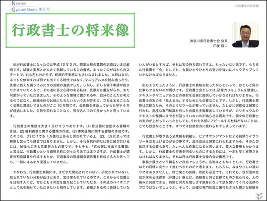 巻頭言「行政書士の将来像」は、神奈川県行政書士会会長の田後隆二先生です。「・・・行政書士業務には、まだまだ開拓されていない、研究されていない、知られていない分野が山ほどあり、宝は埋もれているのです。これから行政書士を目指す人には、ぜひともその宝を掘り起こしていただき、その道のパイオニアとして名を馳せていただきたいと期待しています。・・・」