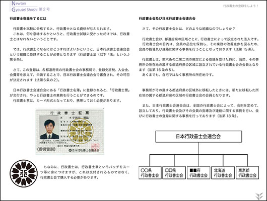 「行政書士の登録をしよう!」は、東京都行政書士会渋谷支部長 (Newton行政書士の世界・企画委員長)宇田川哲哉先生が執筆。「日本行政書士会連合会にある「行政書士名簿」に登録されると、「行政書士票」が交付され、やっと行政書士の業務を行うことができるのです。行政書士票は、カード形式となっており、携帯しておく必要があります。」