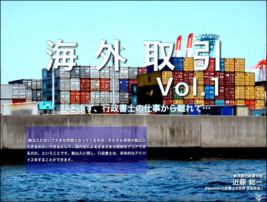 「海外取引 Vol.1」は、東京都行政書士会中野支部(Newton行政書士の世界・企画委員)近藤総一先生が執筆。「輸出入において大きな問題となってくるのは、そもそも貨物が輸出入できるのか、できるとして、国内法によるさまざまな規制をクリアできるのか、ということです。」