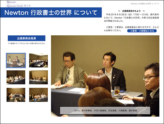 株式会社ニュートンは、2013年7月8日、月刊Newton「行政書士の世界」(電子書籍版)第2号を公開しました。幅広い行政書士業務の広報・普及活動による行政書士業務の拡大を目的としています。(URL)http://gyousei-world.newton-jp.com/(お問い合わせ先)03-5352-7760担当:支配人大久保宏明(mail)okubo@newton-net.co.jp