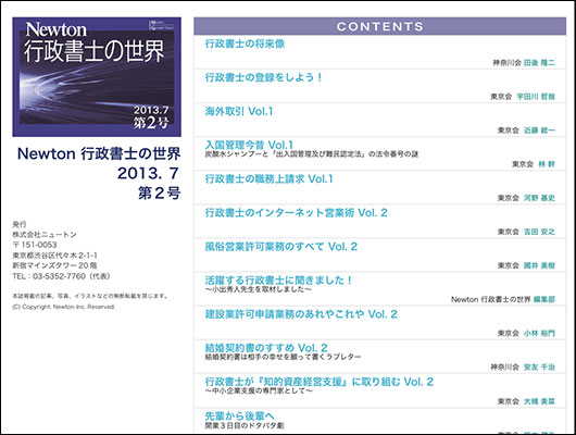株式会社ニュートンは、2013年7月8日、月刊Newton「行政書士の世界」(電子書籍版)第2号を公開しました。幅広い行政書士業務の広報・普及活動による行政書士業務の拡大を目的としています。(URL)http://gyousei-world.newton-jp.com/(お問い合わせ先)03-5352-7760担当:支配人大久保宏明(mail)okubo@newton-net.co.jp