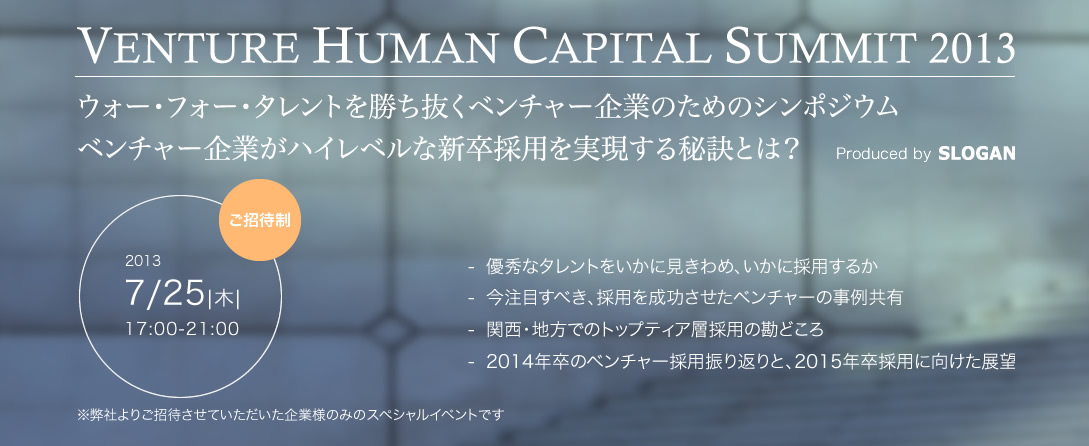 ベンチャー企業向け人材採用支援を手がけるスローガン株式会社(本社:東京都港区、代表取締役社長:伊藤豊)は、ベンチャー企業の経営者・人事・採用責任者向けに、2013年7月25日、 青山本社イベントスペースにて『VENTURE HUMAN CAPITAL SUMMIT 2013』を開催いたします。
