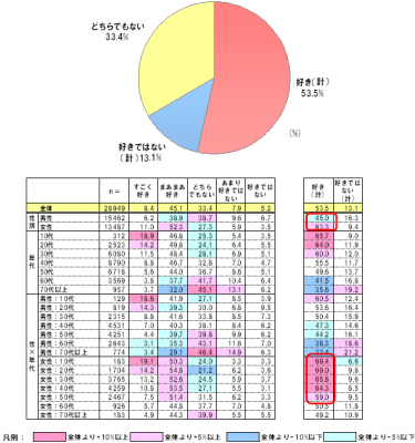 男女別で見ると、女性が全体よりも10ポイント近く高く、特に女性10代~50代の「好き(計)」がほぼ6割となっています。
