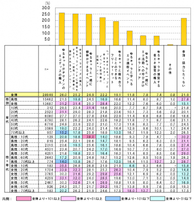 男女別に見ると、上位2つは女性がどちらも3割を超えており、特に10代~50代が全体よりも5ポイント以上高い結果となっています。女性には【グッズ】や【イベント】と気軽に楽しくエコに貢献できる施策が人気であることがうかがえます。