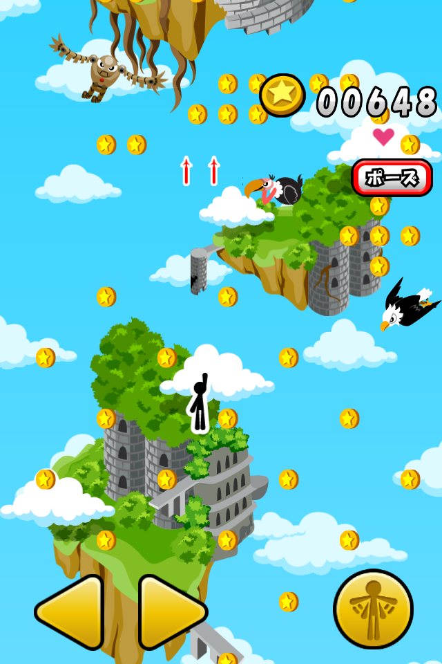 左右のボタンと飛ぶボタンで主人公を操作してコインを取ろう!
