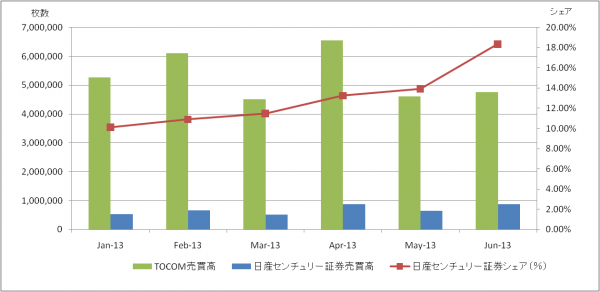 このたび、日産センチュリー証券(所在地:東京都中央区 代表取締役社長:二家英彰)では、東京商品取引所(以下、TOCOM)における平成25年6月の当社の売買枚数が873,973枚、同月の月間総売買枚数シェアが18.37%となりました。