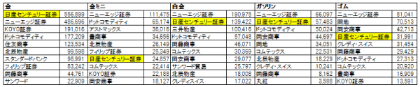 TOCOM6月度主要銘柄別売買高上位10社