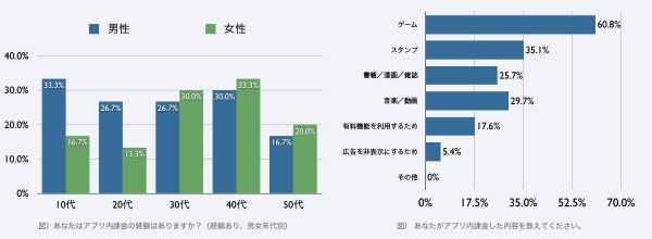 アプリ内課金をしたことがあるユーザーを男女年代別で見ると、男性の場合は10~40代までが平均値(25%)より高いのに対し、女性の場合は50代に加えて10代と20代も平均値を下回った。