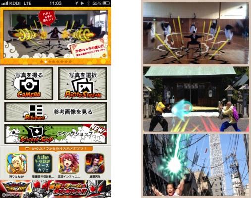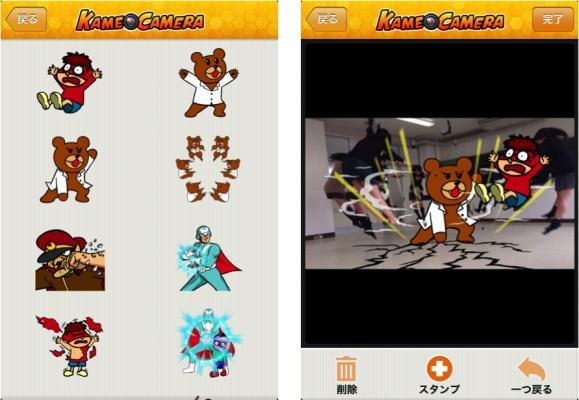 かめカメラとは摩貫光殺砲(マカンコウサッポウ)、波動拳、かめはめ波風の漫画コラージュ写真をスタンプを使って簡単に作ることが出来る写真加工アプリです。リリース10日で10万ダウンロードを達成し、その後もLINE や各種SNS に置けるユーザーの口コミを中心に順調に数字を伸ばし2013年7月1日に40万ダウンロードを達成いたしました。作成された約71万枚の写真の内、約8万枚がLINE や各種SNSで共有されており、仲の知れた友人、家族の間での拡大をしております。