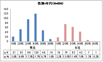 [年代] 10代:39名 20代:128名 30代:159名 40代:162名 50代:55名 60代:11名