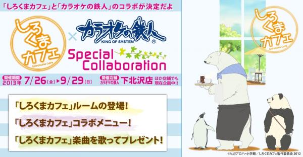 2012年4月から2013年3月まで放送されたアニメ『しろくまカフェ』と「カラオケの鉄人」のコラボレーションキャンペーンは2013年7月26日から2013年9月29日までの間、カラオケの鉄人下北沢店で実施予定。http://www.karatetsu.com/animegame/shirokumacafe.shtml