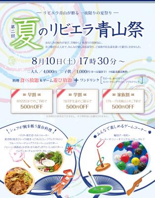 株式会社リビエラ東京は、「夏のリビエラ青山祭」を8/10(土)17:30~開催いたします。料理食べ放題&ゲーム遊び放題+ワンドリンク(生ビール、赤・白ワイン、スパークリングワイン、ソフトドリンク)【シェフが腕を振う屋台料理】 パスタ・焼そば・カルツォーネ・焼き物(焼きとり・イカ焼き・とうもろこし・フランクフルト) フルーツバー・チョップアイス・バーニャカウダー・パニーニ・綿あめ・かき氷・からあげ・ポテト・じゃがバター・パンケーキ・チョコバナナ・ガレット【みんなで楽しめるゲームコーナー】 輪投げ・射的・ヨーヨーすくい・オリジナルパターゴルフ