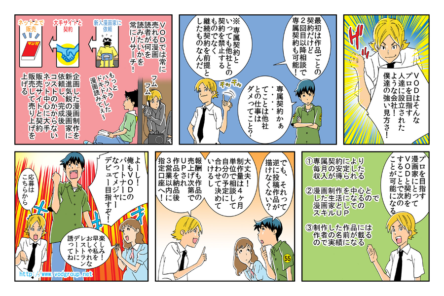 株式会社ベンチャーオンデマンドでは継続契約を積極的に漫画家を結んで漫画家が安定して漫画を制作しながら収入を得られる環境を提供するため設立され現在では毎月300名以上のクリエイターの応募が来ています。