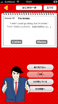 クイズは3択。ヒントをチラ見してもいいだろう。大丈夫、クイズを間違えても誰も責めないよ。多少呆れるけどね。すべての会話をネイティブスピーカーのフル音声で収録してるから、気になるフレーズはそのままこっそり練習して、来るべき日がきたらシャウトすればいい。覚えきれないスラングはメモボタンを押して、後で「メモしたスラング」で確認できる。