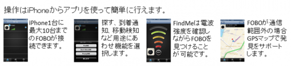 ユニバーサル・ビジネス・テクノロジー(本社:東京都千代田区)は、Balda Solutions Malaysia社(本社:マレーシア)のワイヤレスタグFOBO(フォボ)を7月25日より販売開始いたしまします。これまでのワイヤレスタグはタグを取り付けたキーホルダーや鞄といった持ち物を忘れ物や盗難から守ることが主な機能でした。FOBOはiPhoneアプリを強化することで、マップと連動して駐車した車・バイク・自転車を探したり、預けた荷物が受け取りカウンターに近づいてきたことを知らせたりといった便利な機能が用意されています。