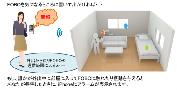 大事なものにFOBOをつけておけば、誰かが勝手に持ち出したり、動かしたりしたときiPhoneにアラームや移動情報が届きます。