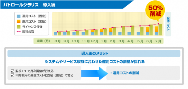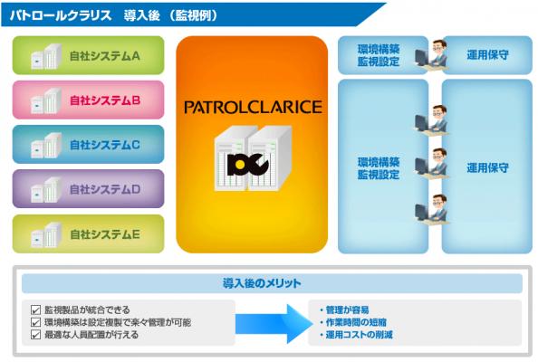 また、中小企業様を中心に急速に展開が進んでいる、社内システムのクラウド移行(自社インフラのプライベートクラウド化やサービス基盤を安価な社外のクラウドへ移行)に伴い、データセンターをお持ちの企業様や監視運用を商用ビジネスとしてご展開されているSIer様からお客様毎に監視マネージャー構築する体制を統合・再編し、弊社サーバー・ネットワーク監視ソフトウェア製品「PATROLCLARICE パトロールクラリス(以下パトロールクラリス)」とオプションの自動音声による電話通知サービス「アラートコール」を併せて導入頂き、クラウド型の監視基盤へ既存の仕組みを転化されるご相談も増えて参りました。