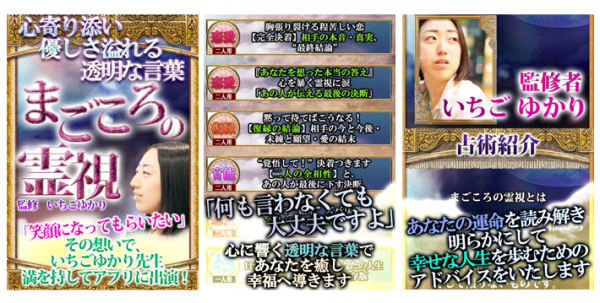 本アプリは監修に老若男女を問わず絶大なる人気を誇る霊能者「いちご ゆかり」を迎え、透明感あふれる言葉で「あなたらしさ」をお教えする占いアプリです。