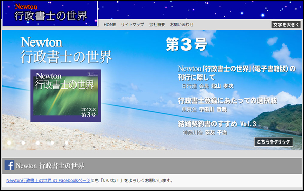 第3号のコンテンツは、(1)Newton「行政書士の世界」(電子書籍版)の刊行に際して(2)行政書士登録にあたっての選択肢(3)結婚契約書のすすめVol.3(4)建設業許可申請業務のあれやこれやVol.3(5)行政書士のインターネット営業術Vol.3(6)風俗営業許可業務のすべてVol.3(7)行政書士が『知的資産経営支援』に取り組むVol.3(8)行政書士の職務上請求Vol.2(9)海外取引Vol.2(10)入国管理今昔Vol.2(11)研修会「渋谷塾」におじゃましました(12)活躍する行政書士に聞きました(13)神奈川会遺言セミナー(14)回想録-NPO法人の役員変更の話が・・・(15)企画委員会のもよう。