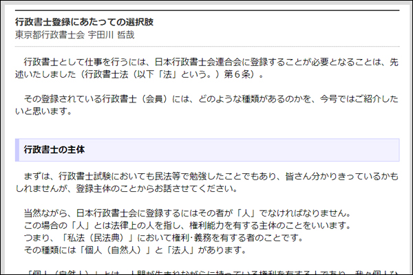 「行政書士登録にあたっての選択肢」は、東京都行政書士会渋谷支部長 (Newton行政書士の世界・企画委員長)宇田川哲哉先生が執筆。「・・・もともと、行政書士登録ができる主体としては、行政書士法公布(昭和26年2月22日)以来、個人で行政書士になることができる資格のある者にしか認められていませんでしたが、平成16年8月1日施行の行政書士法一部改正により、法人が登録することが認められました。・・・」
