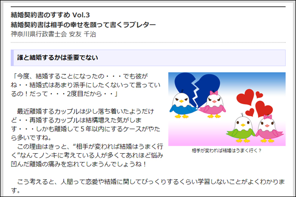 「結婚契約書のすすめ Vol.3」は、神奈川県行政書士会副会長(Newton行政書士の世界・企画委員)安友千治先生が執筆。「・・・いいですか!!“結婚は誰とするのが重要ではなく、どんな結婚をするのかがとてつもなく大事なんです!”間違えないでくださいね!!・・・」