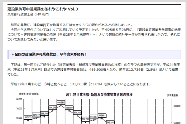 「建設業許可申請業務のあれやこれや Vol.3」は、東京都行政書士会渋谷支部副支部長(Newton行政書士の世界・企画委員)小林裕門先生が執筆。「・・・平成25年5月28日に、「建設業許可業者数調査の結果について-建設業許可業者の現況(平成25年3月末現在)-」という最新の統計データが発表されましたので、それについてお話してみたいと思います。・・・」