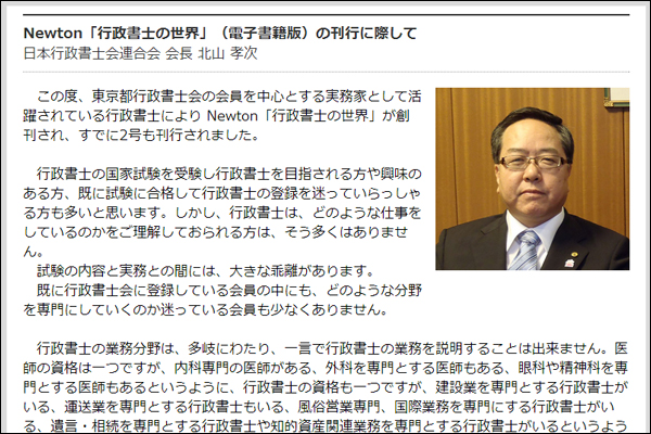 巻頭言は、日本行政書士会連合会会長の北山孝次先生です。「・・・今般の Newton「行政書士の世界」の創刊が、多くの皆様に行政書士をご理解いただける機会をおつくり戴くもの、そして行政書士にとりましても、様々な分野で活躍する実務家の体験と業務を紹介され、実務書としても役立つものと期待を申し上げます。・・・」