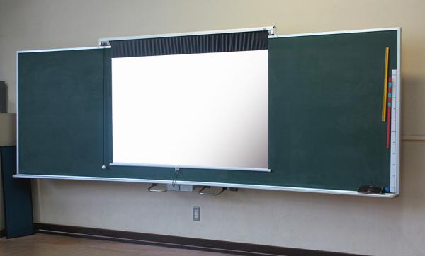 曲面黒板上に短焦点プロジェクターで投写した場合には、画像のゆがみが気になる場合があります。超短焦点プロジェクターは特に顕著に表れますが、これはスクリーン側の問題ではなく、投写面が曲面であることからおこる現象です。プロジェクター側に、曲面投射補正機能の付いたプロジェクターをご使用になる事をお勧めいたします。