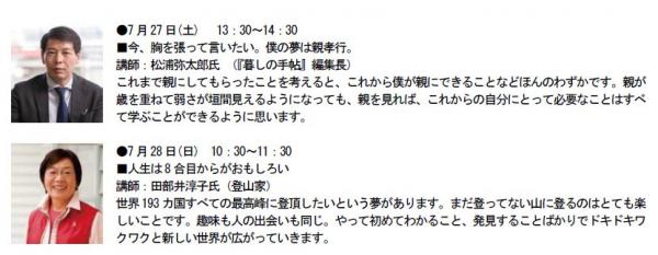 今回は登山家・田部井淳子氏や『暮しの手帖』編集長・松浦弥太郎氏、中医学博士の楊さちこ氏、認知症ケアの服部安子氏をはじめとするゲスト講師のお話から、相続税・老後のお金のことや聴こえなど家族が気になるテーマについて多彩な講師がお話します。