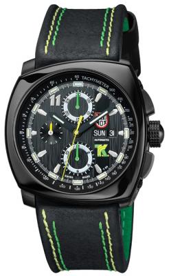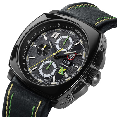 また彼はKVレーシング・テクノロジー#11の車を使用しており、その車や母国ブラジルのトレードカラーでもあるグリーンとイエローが随所に施されています。秒針やクロノグラフの針をはじめ、自己発光システム「ルミノックス・ライト・テクノロジー」にもそのカラーリングが採用されています。