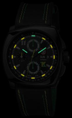 【SPEC】Ref.1188/価格:¥306,600(税込)/2013年7月26日発売/世界限定311本/ケース径:44mm/防水:100m・10atm/ムーブメント Valjoux 7750,Automatic Chronograph/ケース:ブラックPVD加工ステンレススティール/ベゼル:ブラックセラミックベゼル/ケースバック:シースルー、311本シリアルナンバー入り/ガラス:サファイアクリスタルガラス(片面無反射コーティング)/ベルト:ブラックレザーストラップ(イエロー・グリーンステッチ、裏側グリーン)/スイスメイド